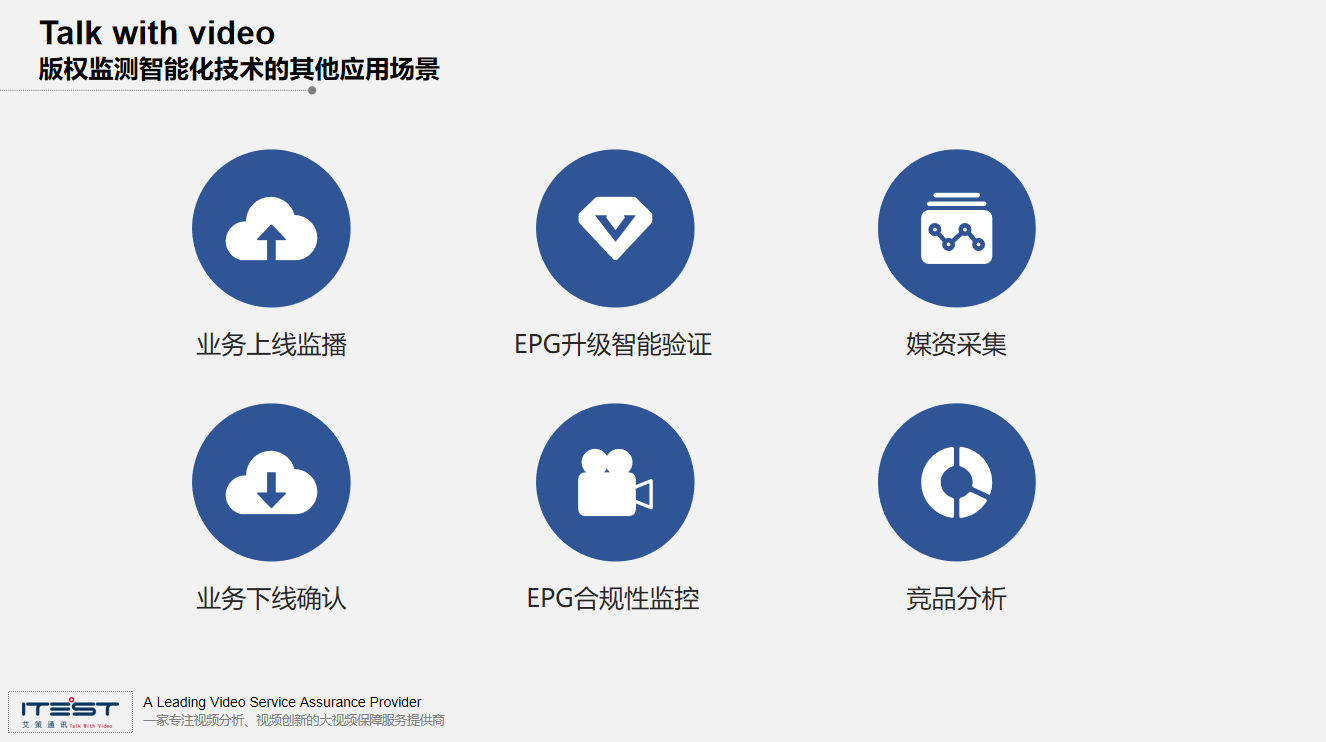其他的應(yīng)用場景,比如說EPG如果要做調(diào)整,不管是EPG的維護(hù),升級或內(nèi)容的改版,同樣可以通過智能化的校驗(yàn)手段,對EPG上的各類業(yè)務(wù)進(jìn)行智能化驗(yàn)證,也可以對EPG是不是合規(guī)進(jìn)行檢測,也可以應(yīng)用在競品分析場景,比如其他先進(jìn)的友商、運(yùn)營商和省份,他做得很好,想跟他做一下借鑒和學(xué)習(xí),有了這種技術(shù)之后,你就可以很方便地去了解他們的動(dòng)態(tài)。也就是說,我們?nèi)W(wǎng)運(yùn)營商、全網(wǎng)的電視大屏有任何的調(diào)整變化,我們都可以及時(shí)快速掃描出來,這樣我們就可以在足不出戶的情況下對友商的情況做到了如指掌。因此我們這個(gè)智能化的技術(shù)除了可以實(shí)現(xiàn)快速的版權(quán)監(jiān)測之外,還可以在更多的維護(hù)和運(yùn)維場景里發(fā)揮巨大的價(jià)值。