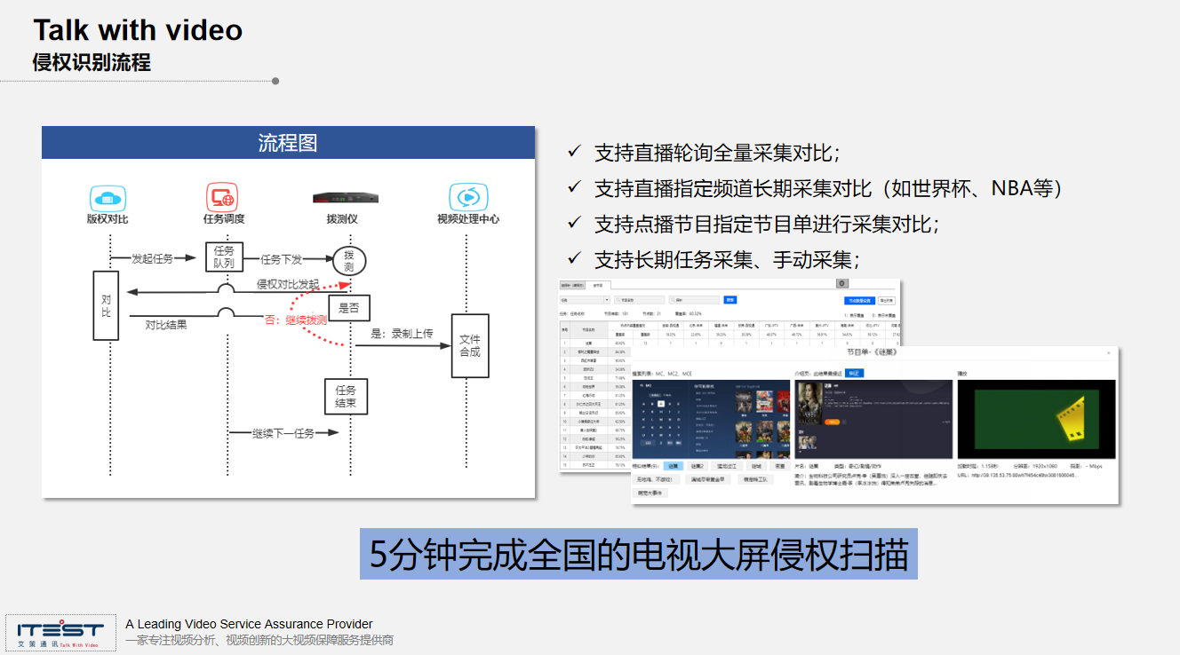 我們具備的這種智能化版權(quán)監(jiān)測能力,是基于早期對整個(gè)IPTV/OTT領(lǐng)域里建立的相關(guān)AI學(xué)習(xí)模型來完成的。大家如果要進(jìn)行侵權(quán)檢測,只需要發(fā)起一個(gè)指令,我們就可以對全網(wǎng)進(jìn)行掃描,這個(gè)全網(wǎng)可以是全國31個(gè)省份的任意省,任意的一個(gè)電視大屏,都可以進(jìn)行侵權(quán)掃描。這個(gè)掃描能力依賴于我們艾策公司近年來不斷積累下來的,關(guān)于電視大屏的相關(guān)素材庫,以及一些已經(jīng)完成訓(xùn)練和學(xué)習(xí)的各種AI識別模型來完成,有了這些基礎(chǔ),就可以對所有電視大屏的內(nèi)容進(jìn)行自動(dòng)化分析。分析完畢就可以發(fā)現(xiàn)有沒有侵權(quán)行為。解決電視大屏版權(quán)監(jiān)測的核心就在于我們積累的這些庫和模型。