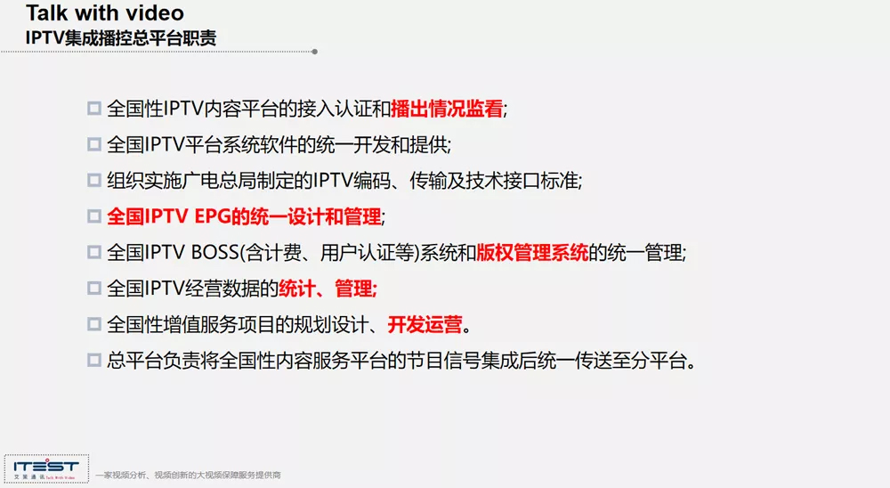 今天參會的有很多老面孔,都是比較了解IPTV一路發(fā)展的,從2010年344號文到2012年的43號文,再到2019年的76號文,整個的政策都是向著IPTV良好的可管可控持續(xù)在進行發(fā)展。文件里提出的是統(tǒng)一的規(guī)劃,統(tǒng)一的標準,統(tǒng)一組織和統(tǒng)一的管理。