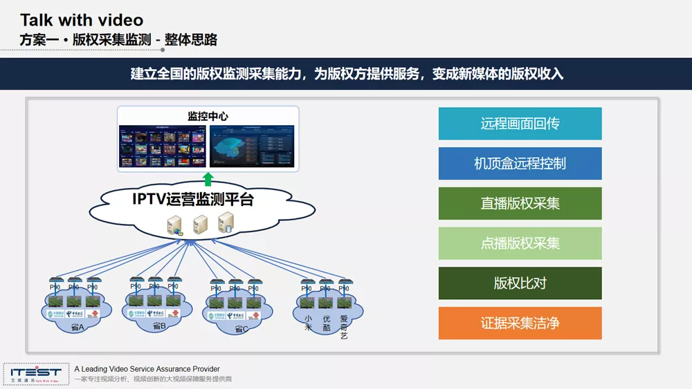 第一個部分版權采集監(jiān)播,艾策目前在全國31個省每一個省的省會城市,已經(jīng)部署覆蓋數(shù)字電視、IPTV、移動、電信、聯(lián)通運營商,你給我一個單子我可以半個小時查出來哪一個省份有侵權行為的發(fā)生,在整個取證的過程中,通過機頂盒的遠程控制,大量采集的數(shù)據(jù)就可以直接進行一個互聯(lián)網(wǎng)法院一個相關證據(jù)的清潔性,可以作為證據(jù)進行輸送的,這是版權監(jiān)測這部分。上一次跟我們有一個國內比較大的播控方,他就對他們目前手里面的大概有數(shù)十萬小時的內容都認為在每個省的分發(fā)都存在版權上的問題,有些版權是到期的,可能沒有下線,有一些可能還沒有授權的,可就私自上線的,目前艾策通訊已經(jīng)在省會城市部署這一套采集和監(jiān)測的平臺。
