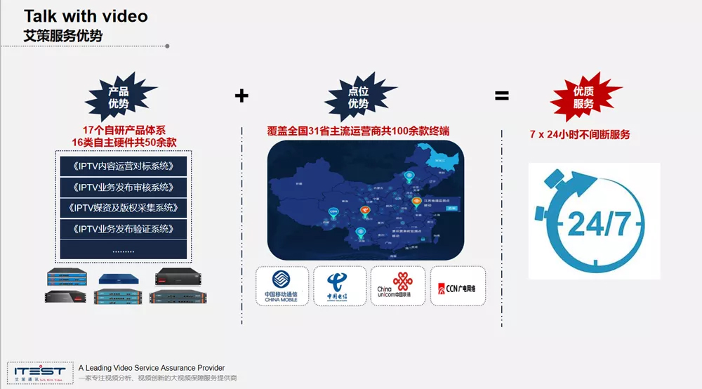 最后打一個廣告,我們是成立于2007年到現(xiàn)在已經(jīng)有13年,從成立到現(xiàn)在一直做IPTV、OTT大屏的領域,我們側重于內容安全、內容版權、內容質量、內容防篡改、內容播控、內容監(jiān)管等,大概目前有50多項專利,我們還深入?yún)⑴c了G20峰會等等。目前我們已經(jīng)有17個自研產(chǎn)品體系、16類自主硬件共50余款產(chǎn)品,結合到我們全國的部署能力,現(xiàn)在可以為客戶提供7x24小時不間斷的服務。