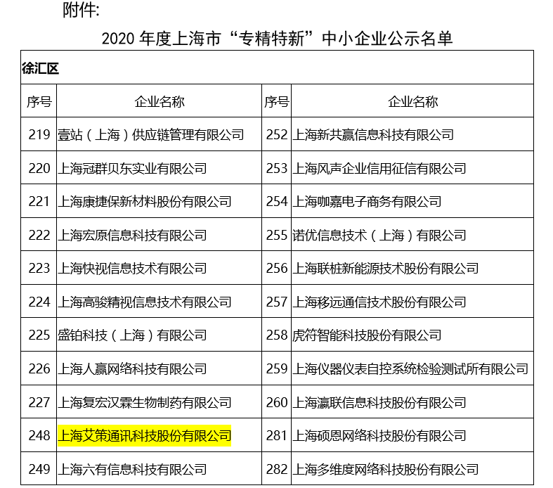近日,2020年度上海市“專精特新”企業(yè)名單公示,上海市徐匯區(qū)65家企業(yè)入選該名單,其中包括上海艾策通訊科技股份有限公司。